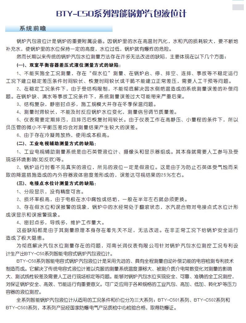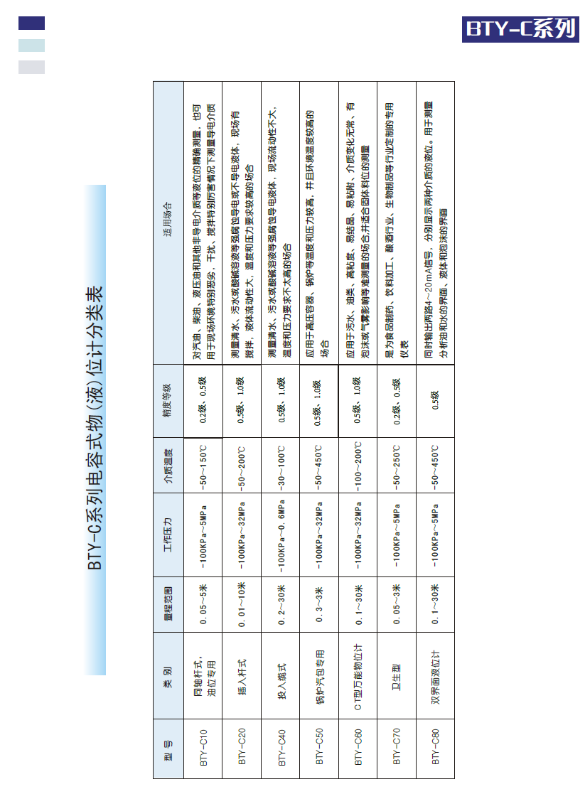 BTY-C系列電容式物位計采用一種基于全數(shù)字化電容測量方法,并運用多參數(shù)補償技術(shù),研制出一系列高精度的物位計,已經(jīng)在多個領(lǐng)域試用成功。例如安裝在機動車輛上的電容式油位傳感器,在各種強腐蝕、高溫、劇毒、爆炸等高危險場合使用的電容式高溫高壓液位計,能自動適應(yīng)各種介質(zhì)的高精度CT型物位計。這些物位計在有關(guān)行業(yè)試用,得到了有關(guān)行家的一致好評。